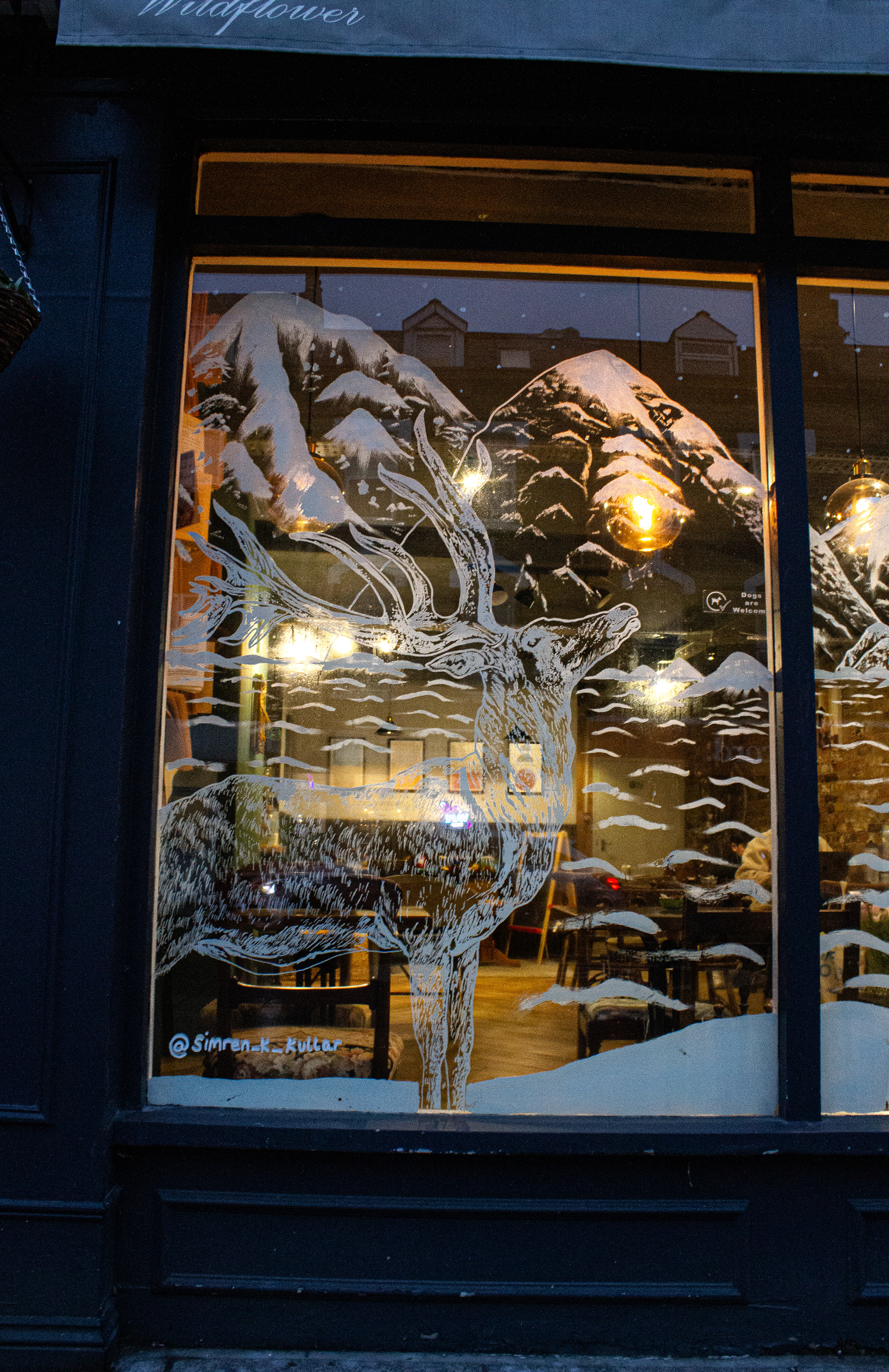 A Custom Winter Mural for a wonderful Studio Cafe & Florist on Hampton Hill. With Bushy Park a stones throw away, the glorious Deers of the nature haven were an inspiration for this Mural. The design and composition of this piece were specifically aimed to create a unique identity for the business, beautify their café front, create buzz on the busy high street, and celebrate the festive season.