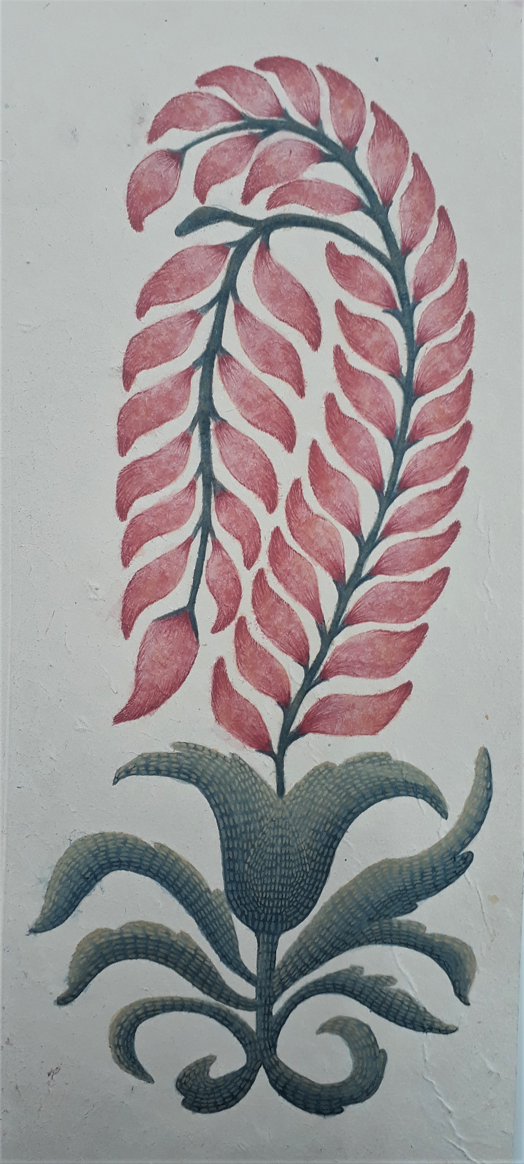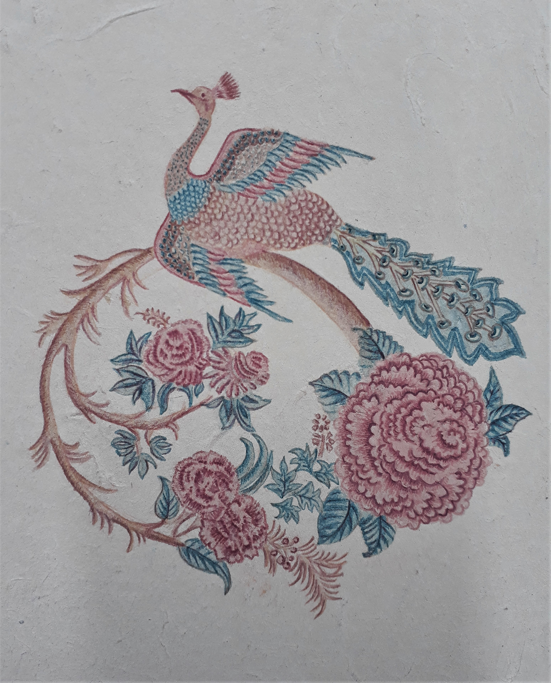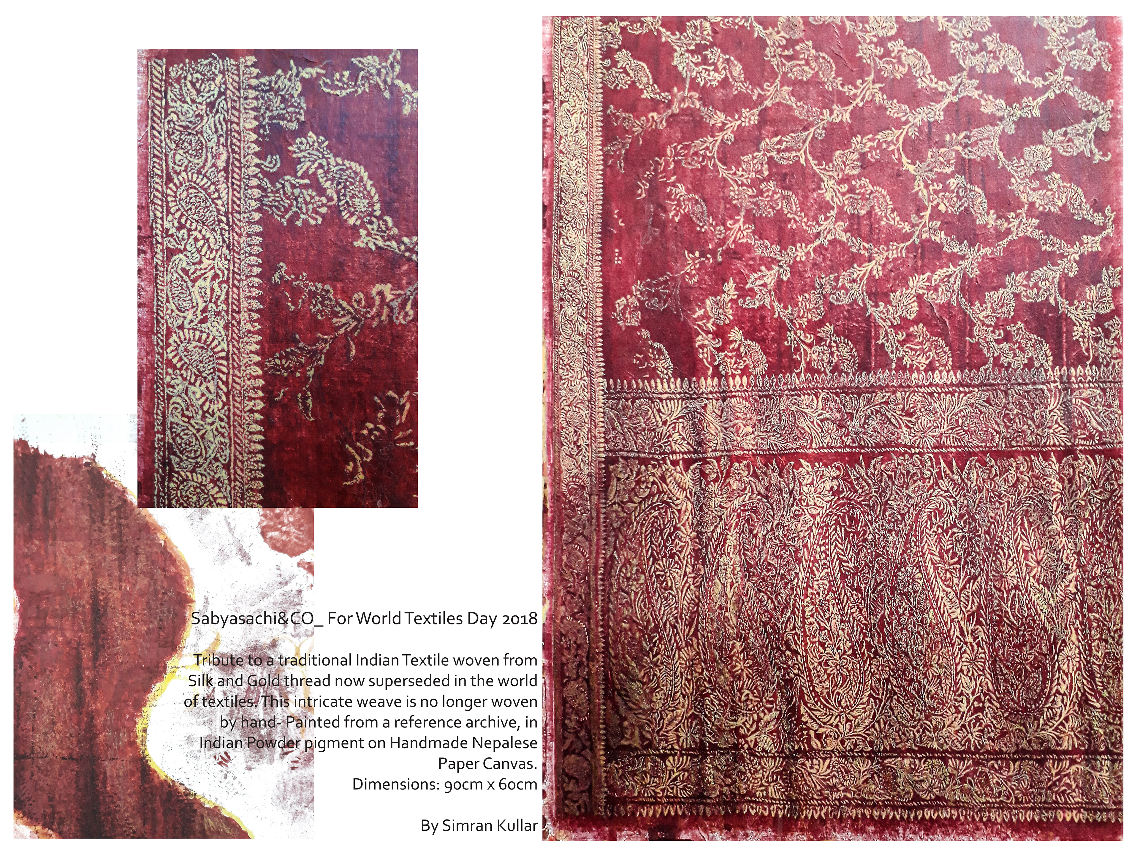 During my year working with acclaimed designer Sabyasachi Mukherjee in Kolkata, I refined a rare and highly specialised heritage technique — preparing and applying natural powder pigments, hand-crushed and blended into hundreds of custom shades. These were painted onto handmade Nepalese paper in a style inspired by Mysore and royal palace murals of India, blending centuries-old tradition with contemporary elegance.